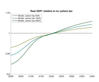 This is the impact of GDP. (In this model, warming does cause considerable damage to GDP, which I will talk about in the next blog post.) Reducing carbon emissions now consumes a lot of GDP in exchange for a moderate increase later.